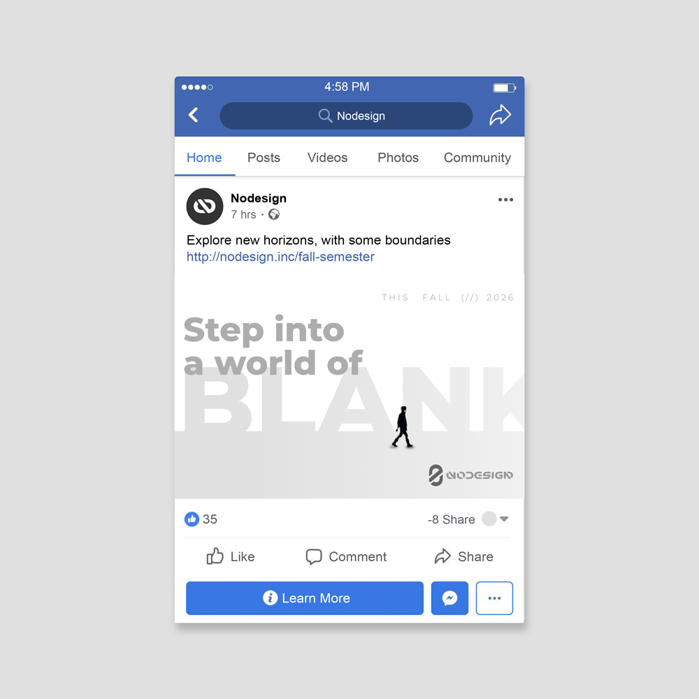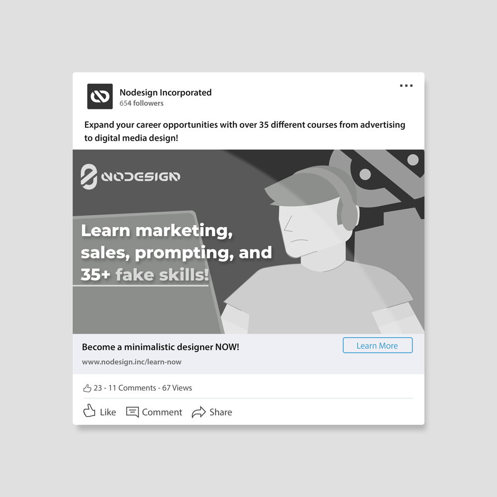 NODESIGN Inc. is a fictional design and marketing association that offers mentorships that teach corporate-like strategies to production artists and designers. This is a fully satirical project with the purpose of poking fun at companies who opt for extremely minimalistic and colorless brand identities. The end goal was to break down poor and effortless designs while sticking to fundamentals to make the viewer aware of how comically basic these actually look like in the eyes of a creative.